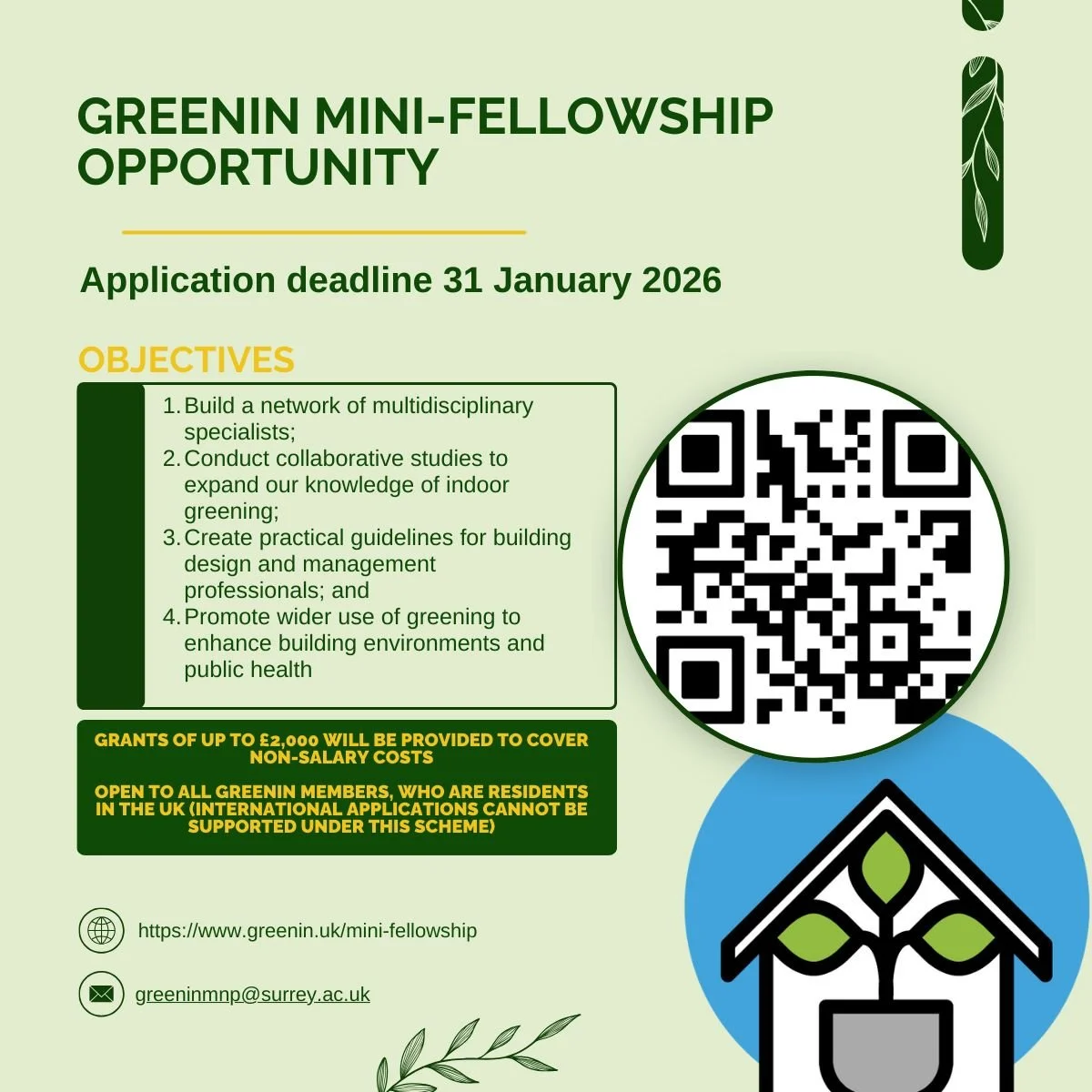 It is a full day online event bringing together experts from academia, industry, policy, and communities to co-create feasibility study ideas focused on indoor greening. Up to £30k funding is available for 3–4 feasibility studies (6–9 months), open to UK based GREENIN members who attend the workshop. The workshop itself will take place on 12 March 2026. More information is available on our website.
