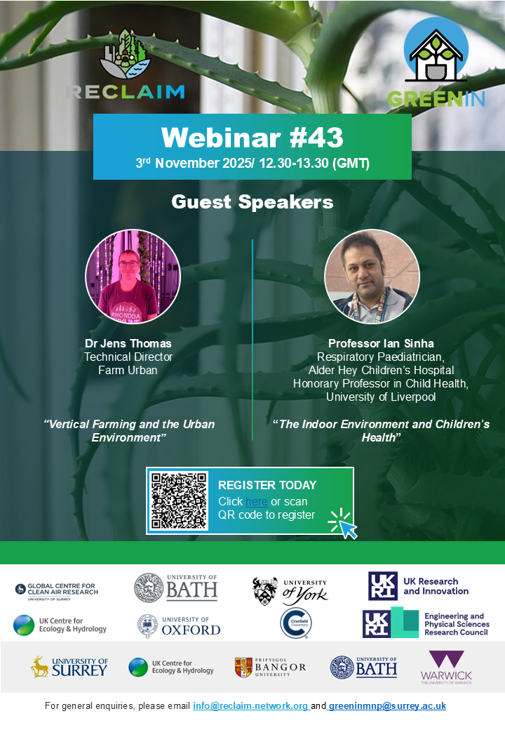 These webinars will share best practices and encourage knowledge exchange between practitioners, researchers, policymakers, businesses, charities and individuals interested in indoor green infrastructures.